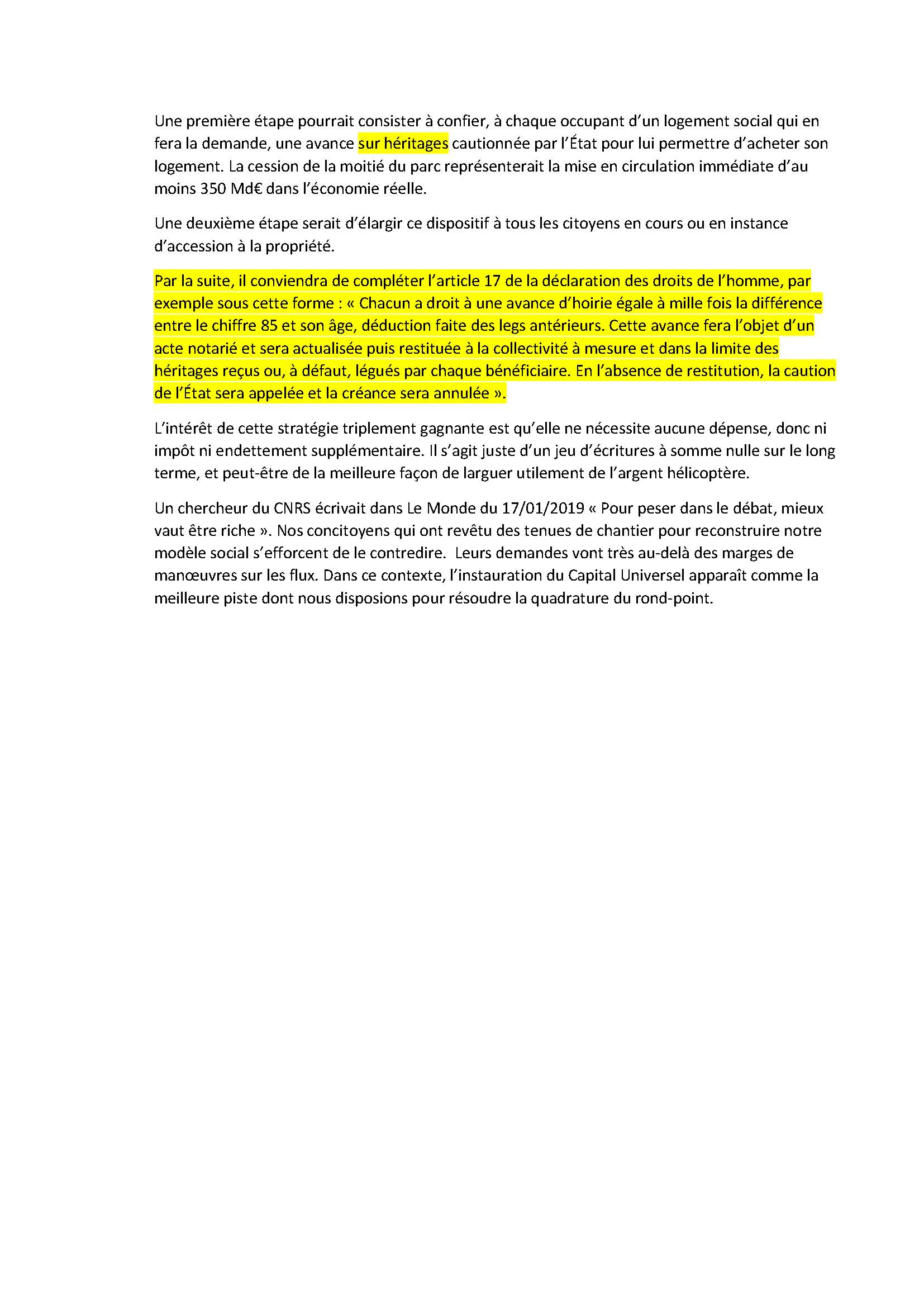 Les membres du bureau de l'Association AICU sont perplexes vis à de l'intérêt et même de la sincérité de cette plateforme. Cela dit, après avoir consulté une partie des 900 propositions mises en ligne, nous considérons qu'une parution sur cette plateforme peut a minima contribuer à faire connaître la cause "Capital Universel sous forme d'avance sur héritage" et nous n'avons pas d'objection à ce que ce concept soit relayé ou même récupéré par quelle qu'organisation politique non-extrémiste que ce soit. Préalablement à cette éventuelle parution, un premier jet est proposé ci-dessous, dans le but de recueillir d'éventuels commentaires, suggestions ou objections que nous vous remercions d'adresser par mail à : dc@aicu.fr
